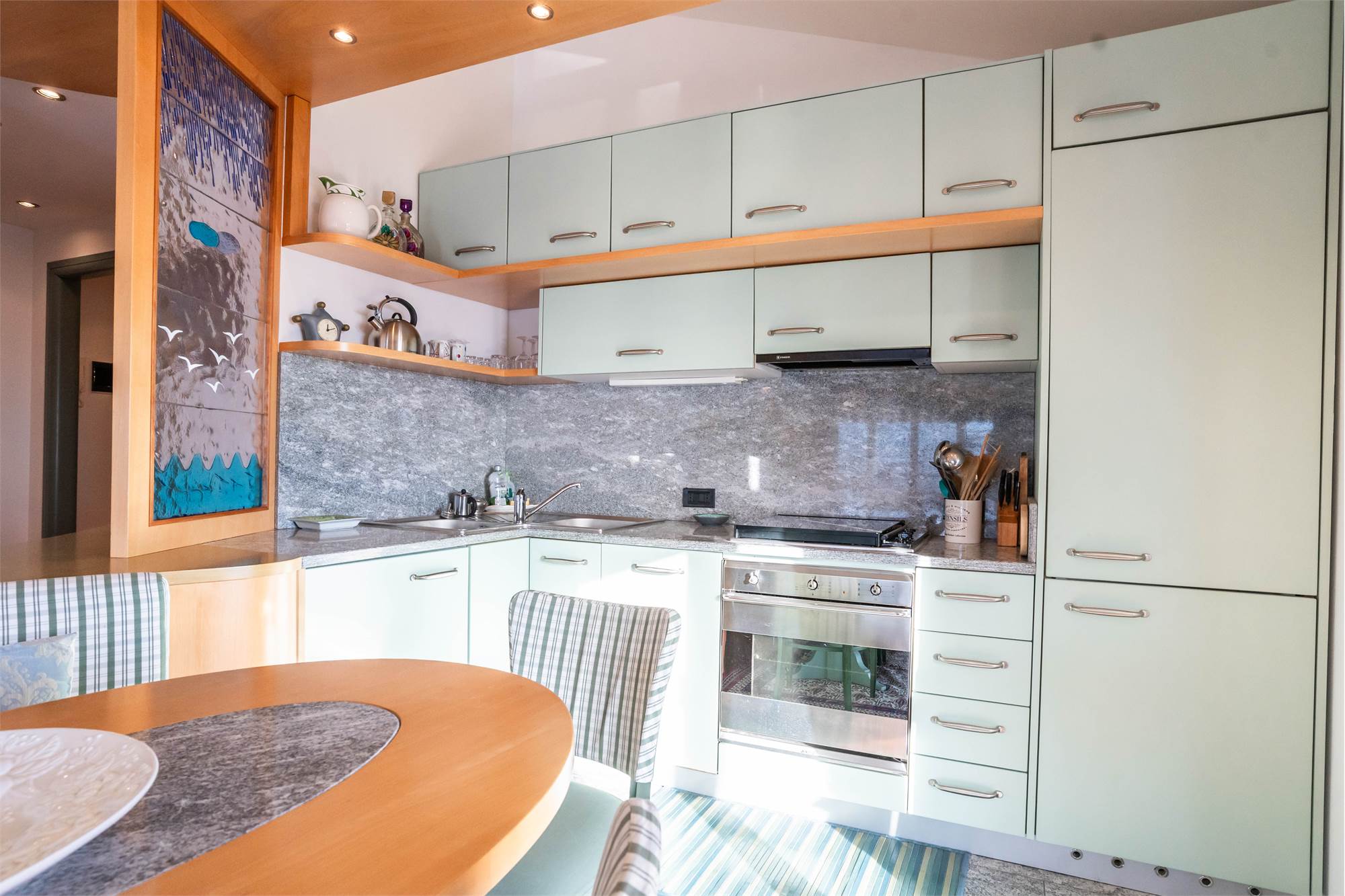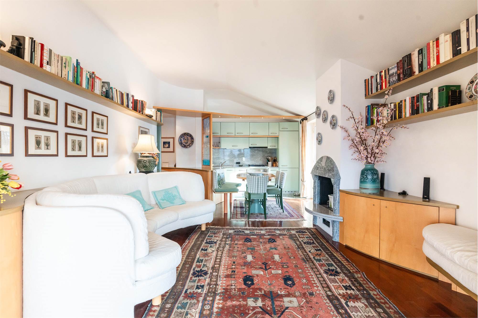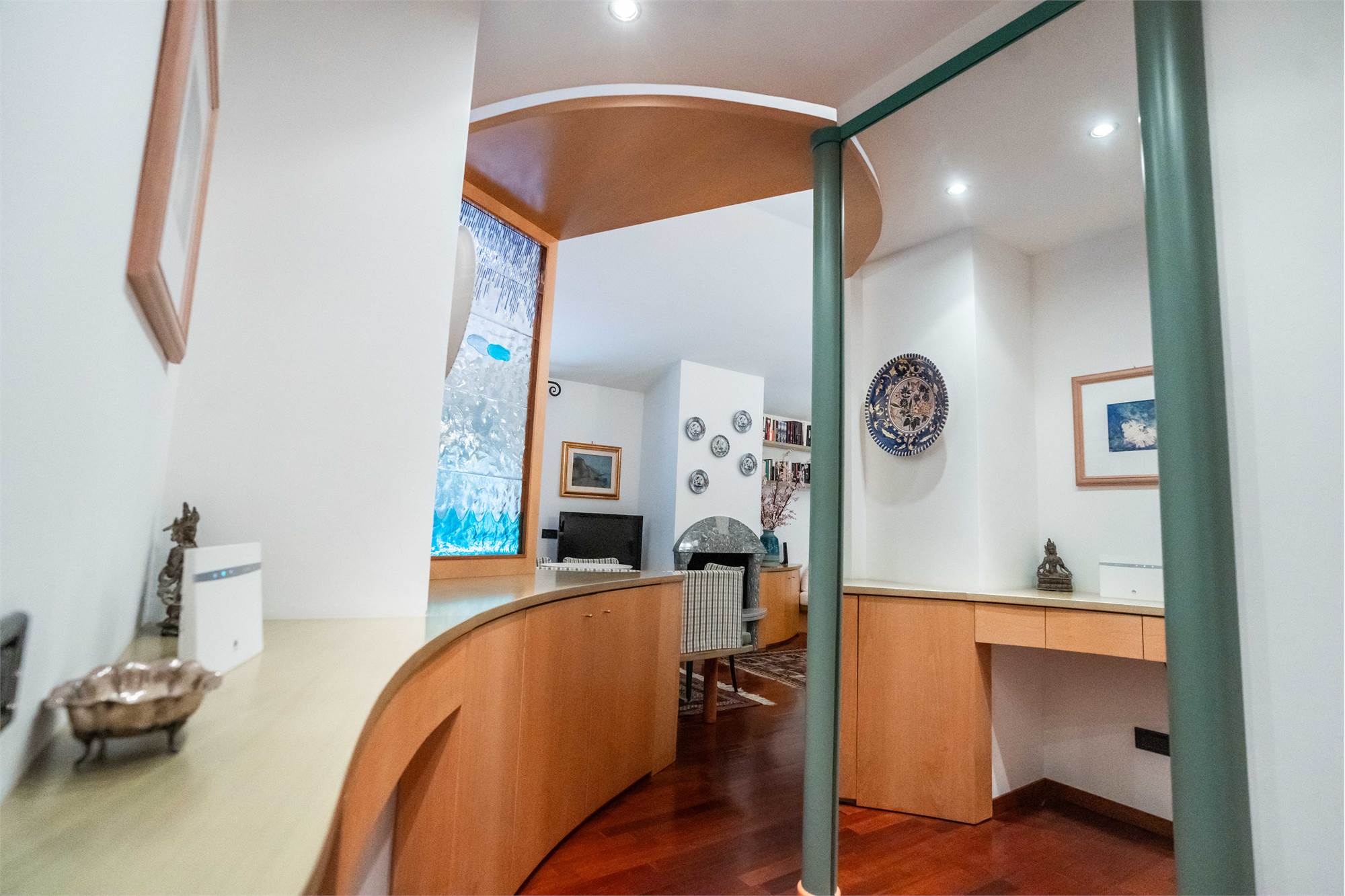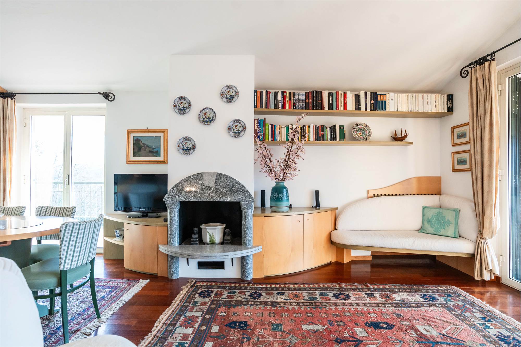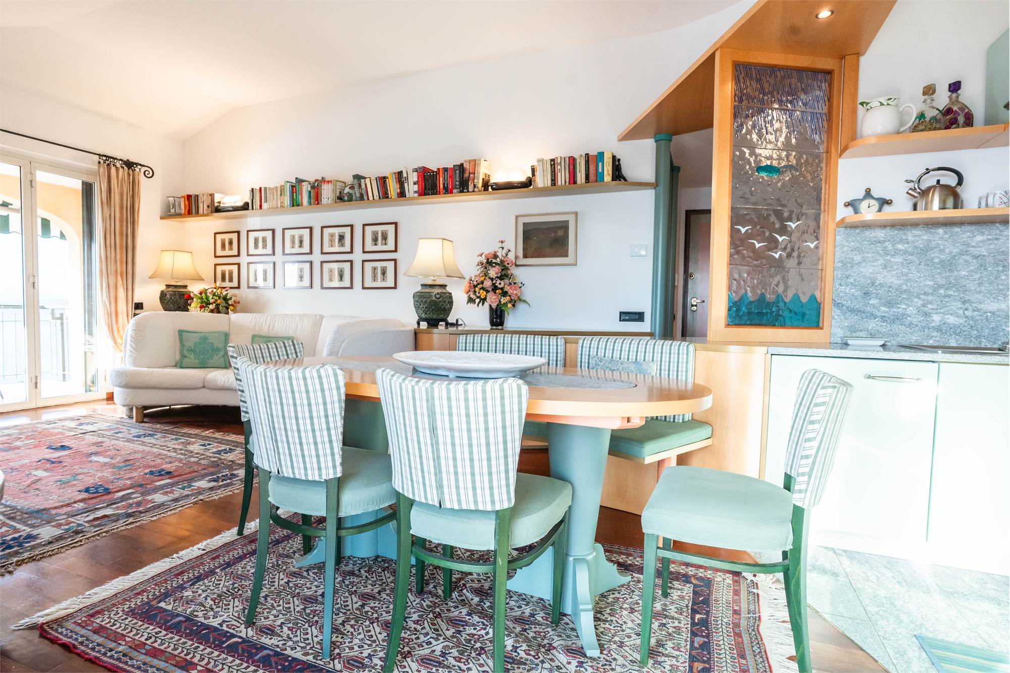 Il soggiorno con angolo cottura, elegantemente arredato e perfettamente integrato negli spazi, è ampio e luminoso, impreziosito da un camino funzionante che rende l’ambiente particolarmente accogliente nelle stagioni più fresche e valorizza la vivibilità dell’immobile durante tutto l’anno.