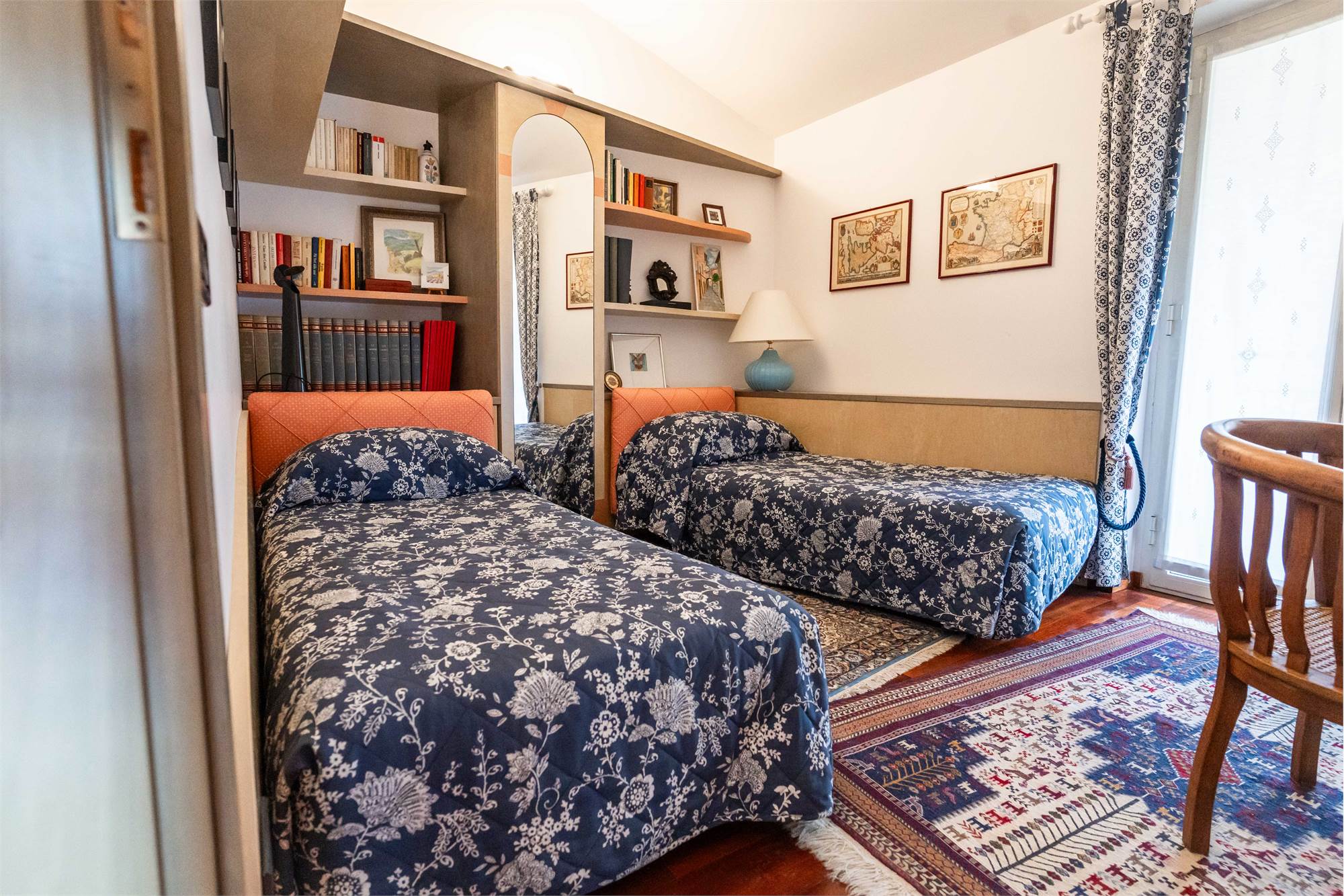 cameretta con due posti letto, scrivania e arredi su misura, con accesso al balcone e vista sul parco condominiale,