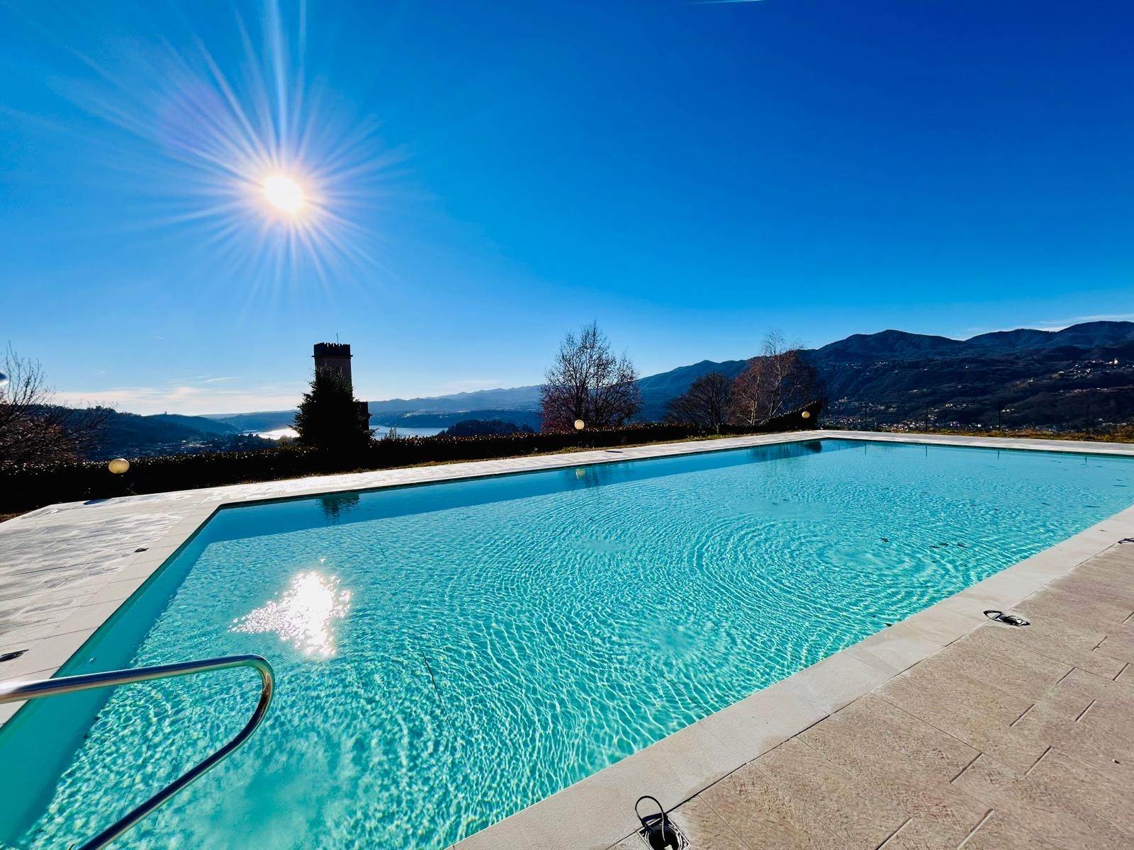 Elegante trilocale panoramico con terrazzi, camino e piscina vista lago (nuova 2025)