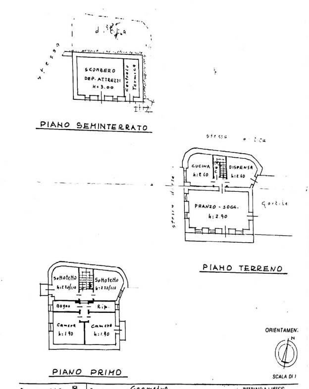 La casa principale, di circa 180 metri quadrati, si sviluppa su tre livelli. Al piano seminterrato si trovano i locali di servizio, un ambiente adatto a hobby o studio e la centrale termica. Al piano terra, il grande soggiorno con camino e cinque finestre guarda verso il verde del giardino e il ruscello; accanto si trovano il tinello/studio, una cucina in muratura e un bagno di servizio.