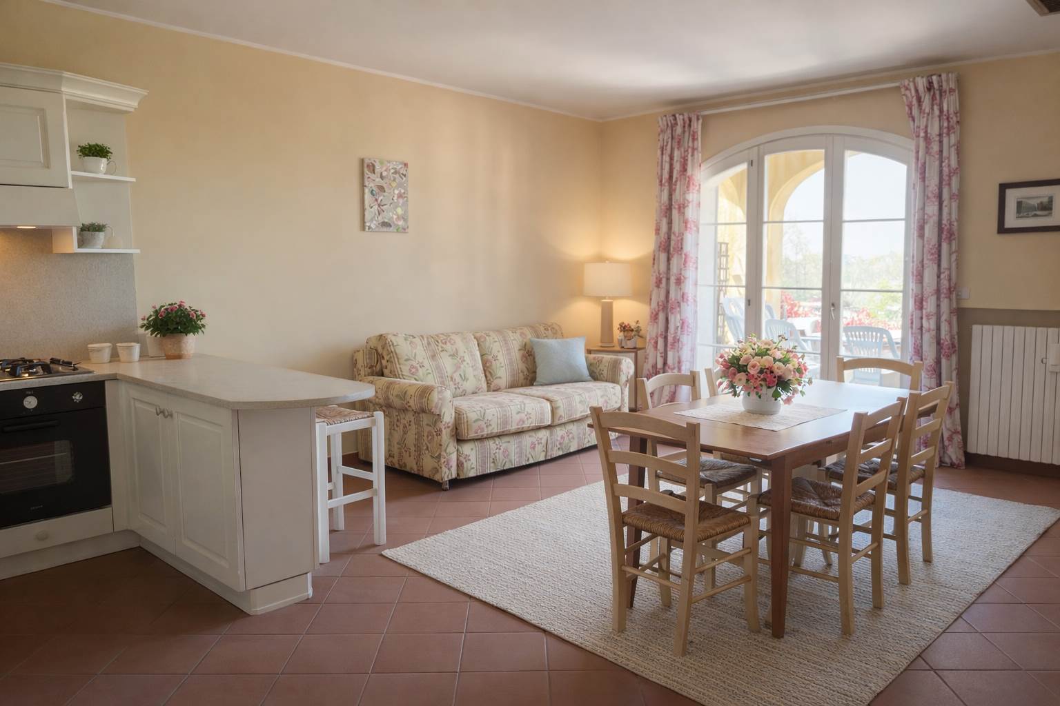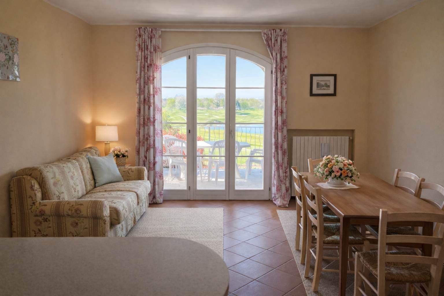 L’ingresso conduce a un ampio e luminoso soggiorno con cucina a vista, caratterizzato da un affaccio diretto su un terrazzo coperto da cui si gode un’incantevole vista sul verde e sul campo da golf, ideale per momenti di relax e convivialità.