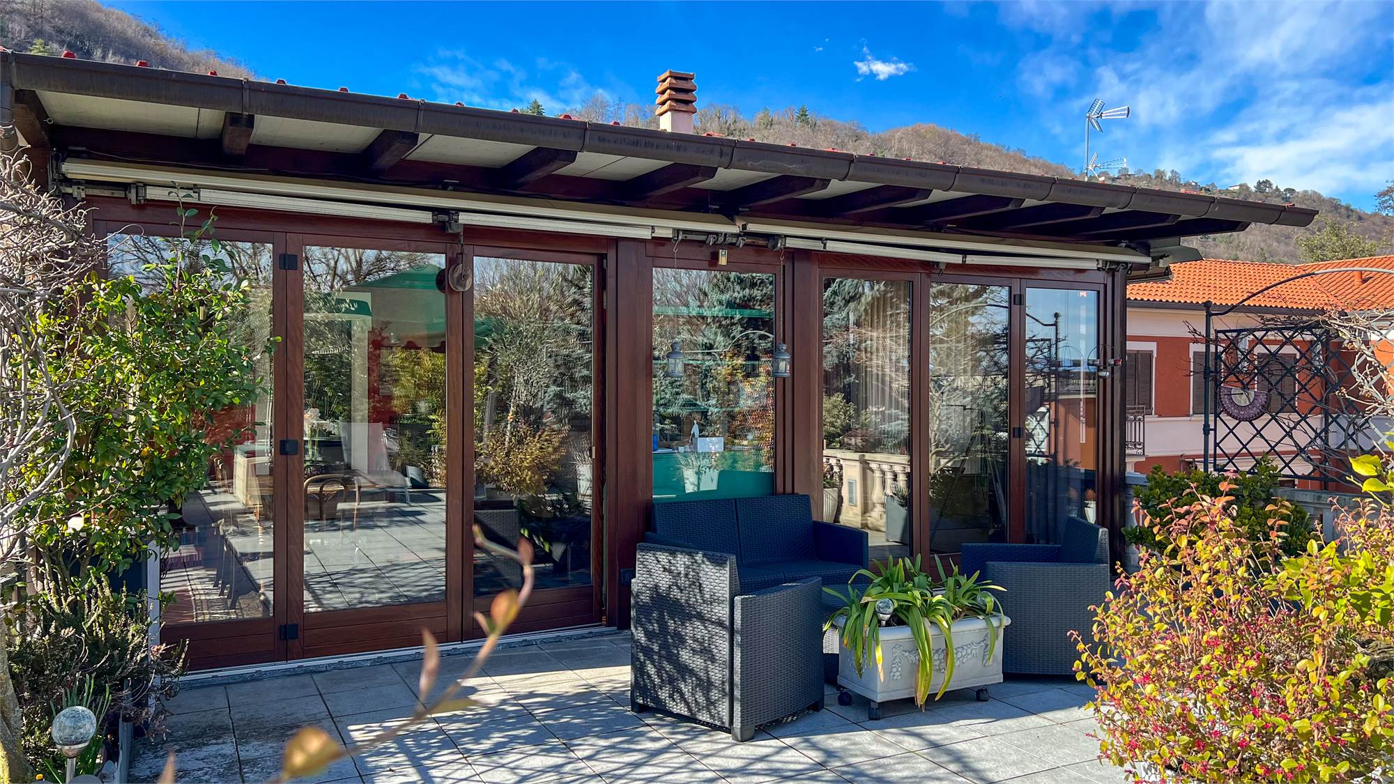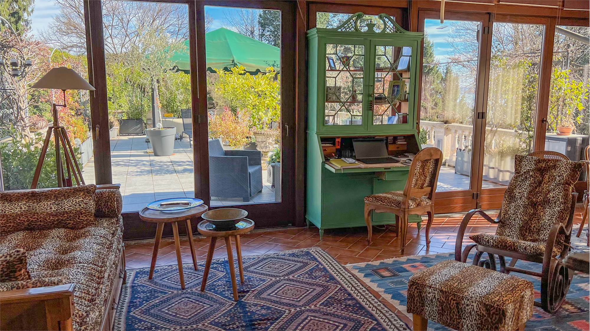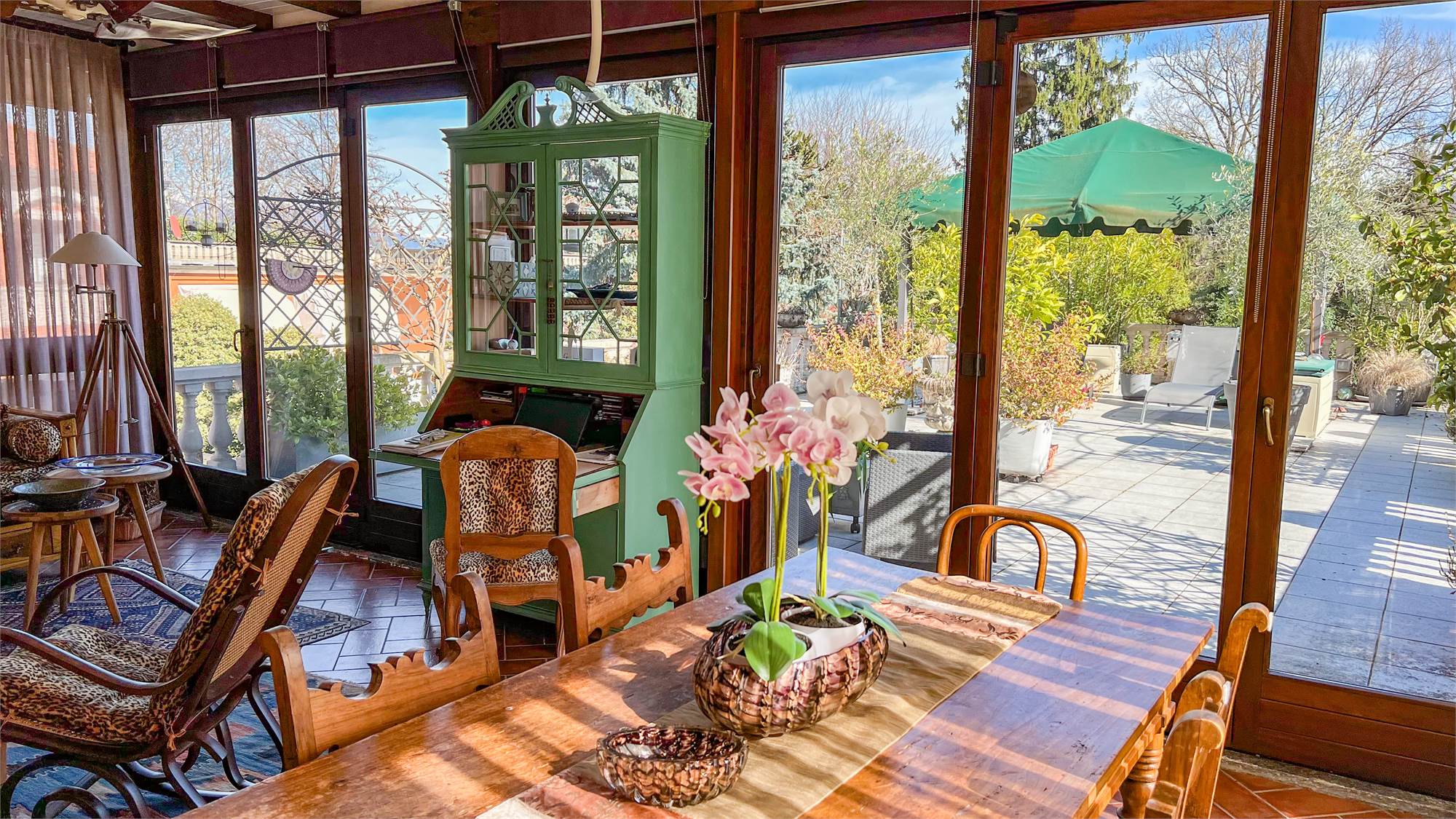 Elemento di grande fascino è la veranda completamente finestrata, uno spazio luminoso e versatile che accompagna verso l’esterno e permette di vivere la casa in ogni stagione.