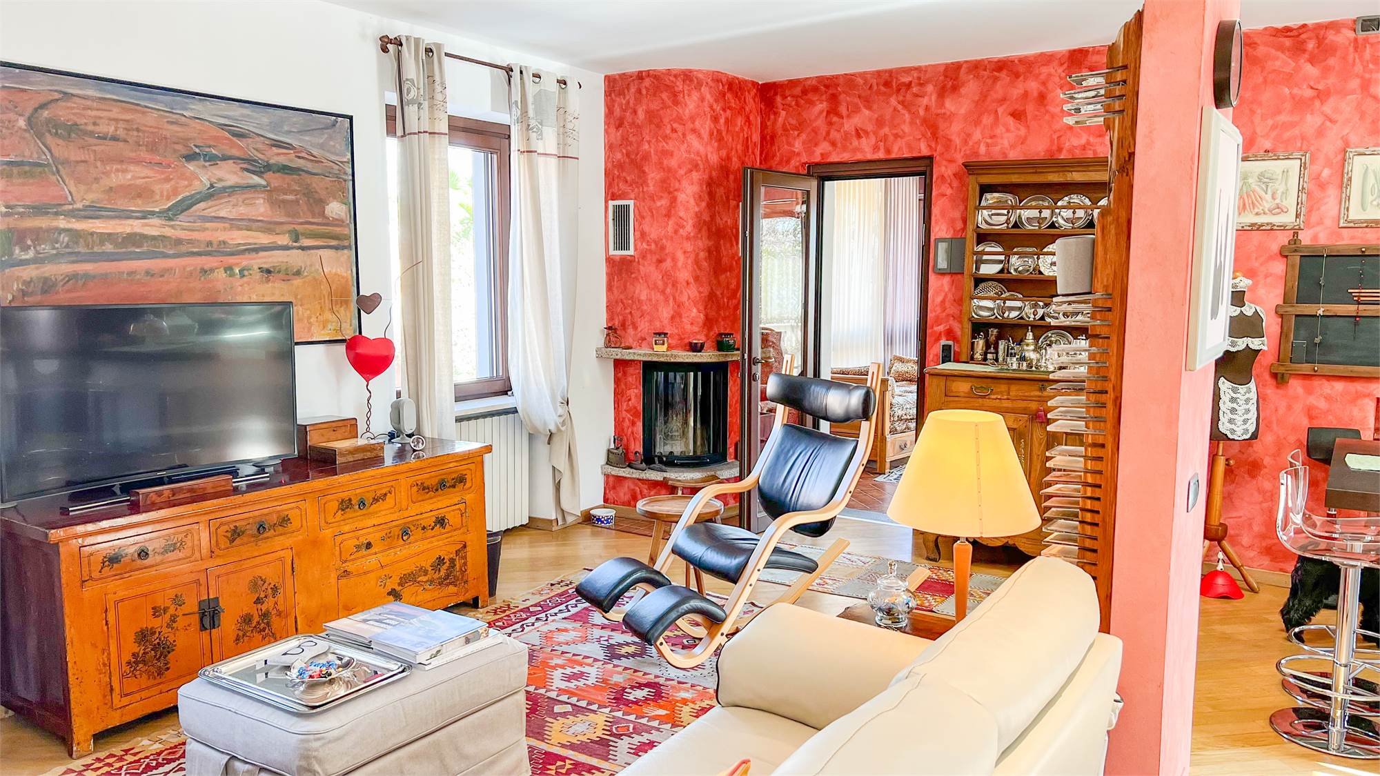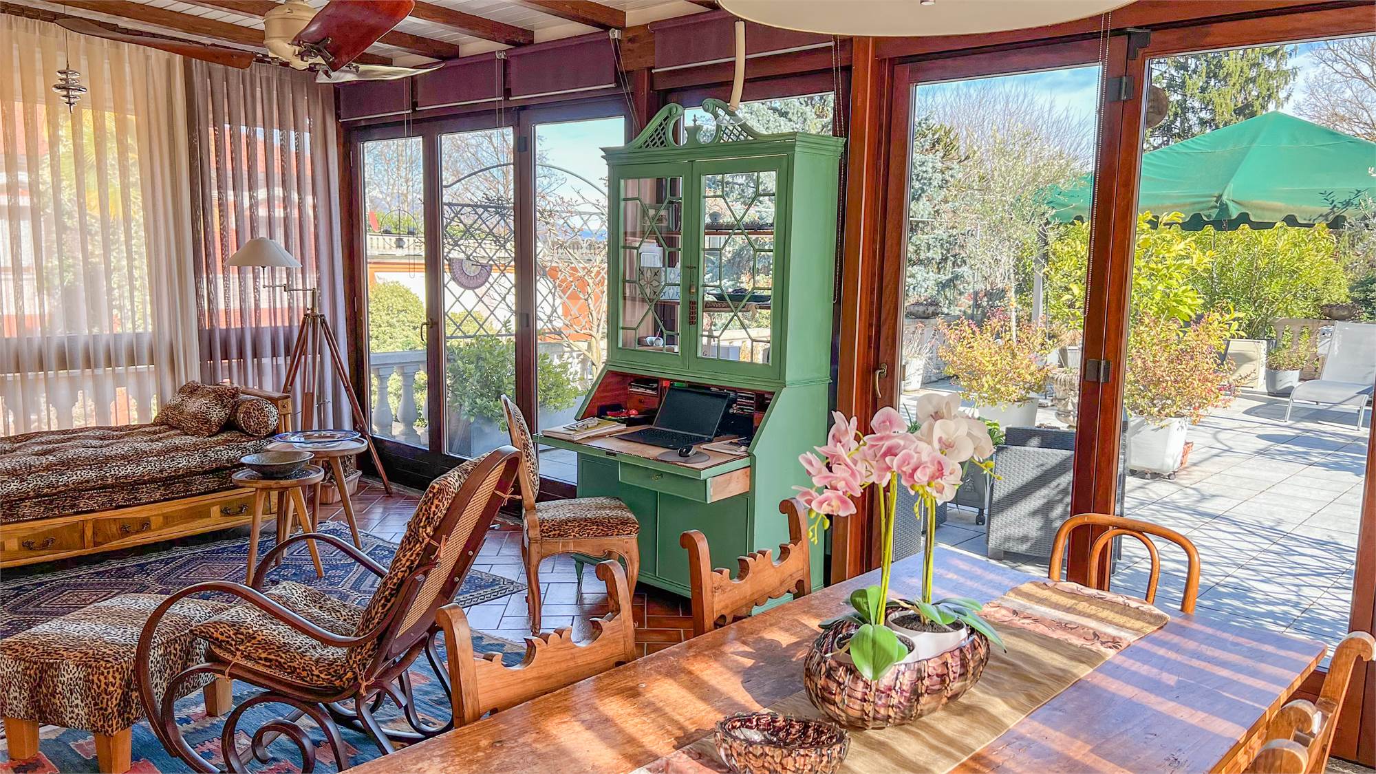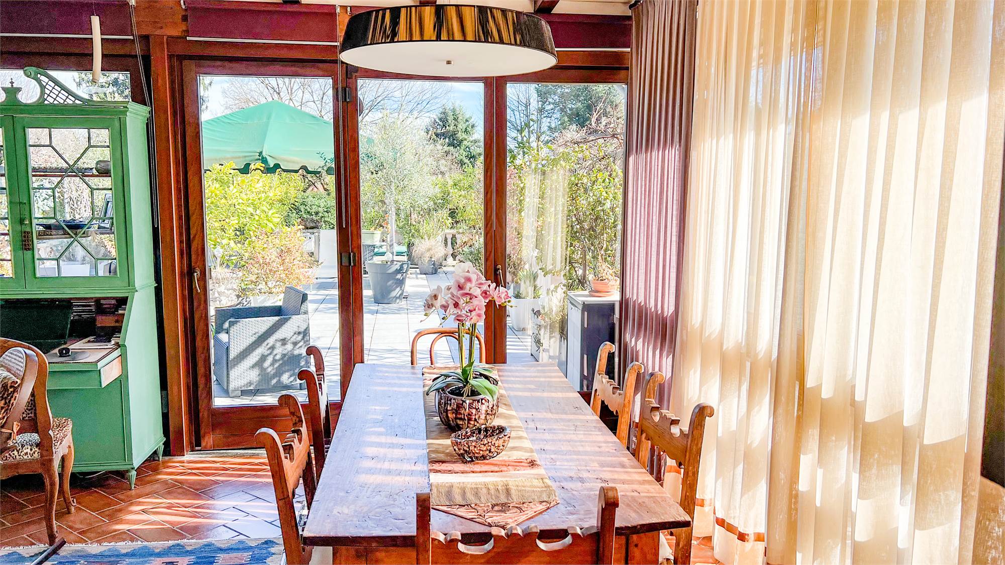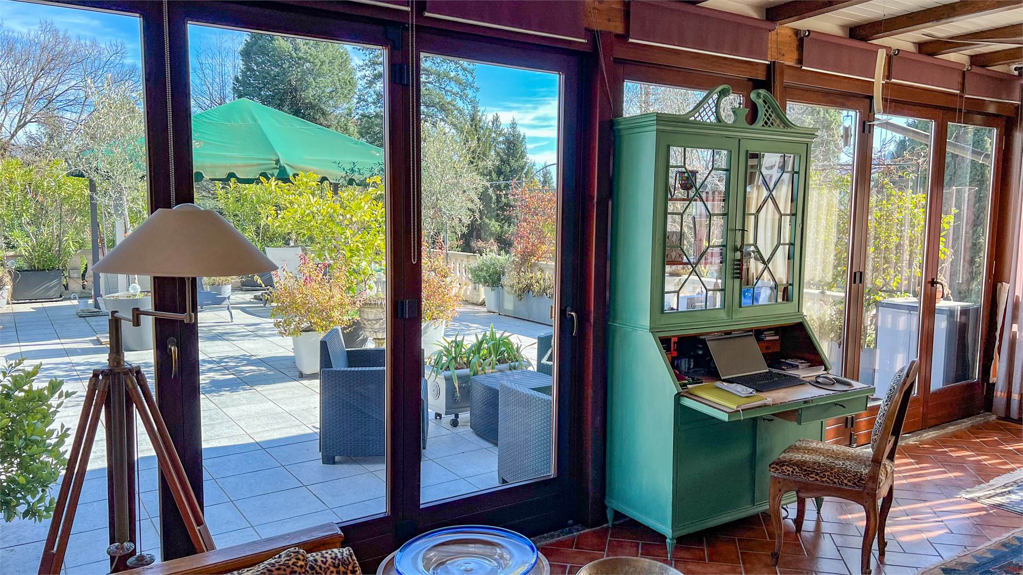 Elemento di grande fascino è la veranda completamente finestrata, uno spazio luminoso e versatile che accompagna verso l’esterno e permette di vivere la casa in ogni stagione.