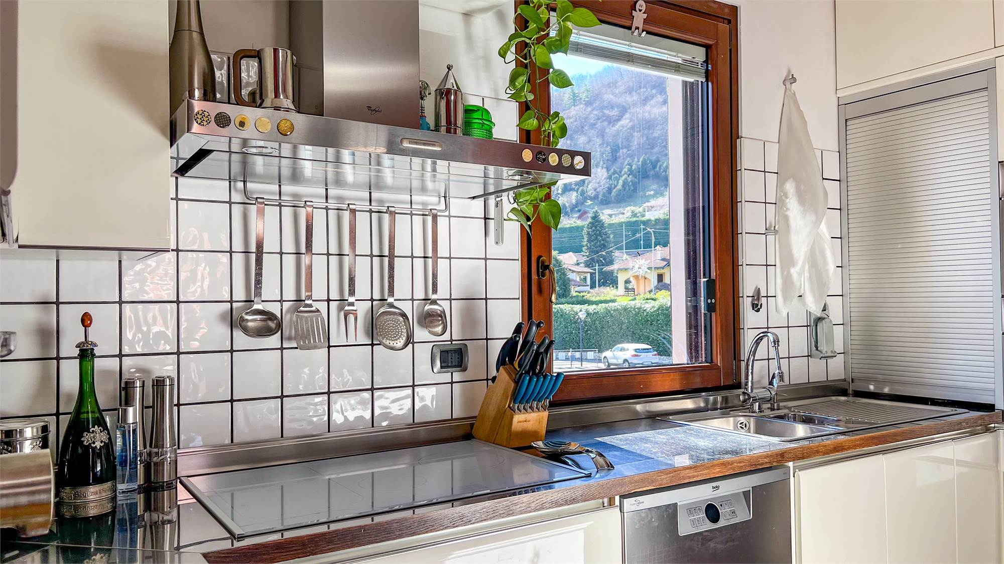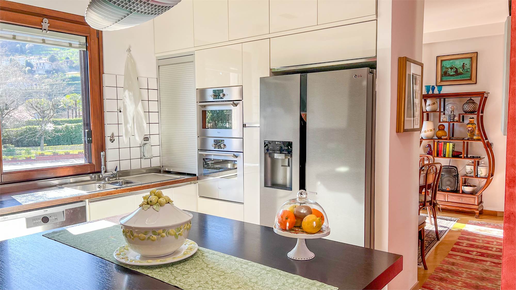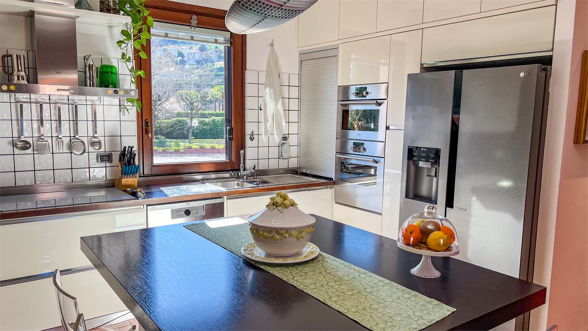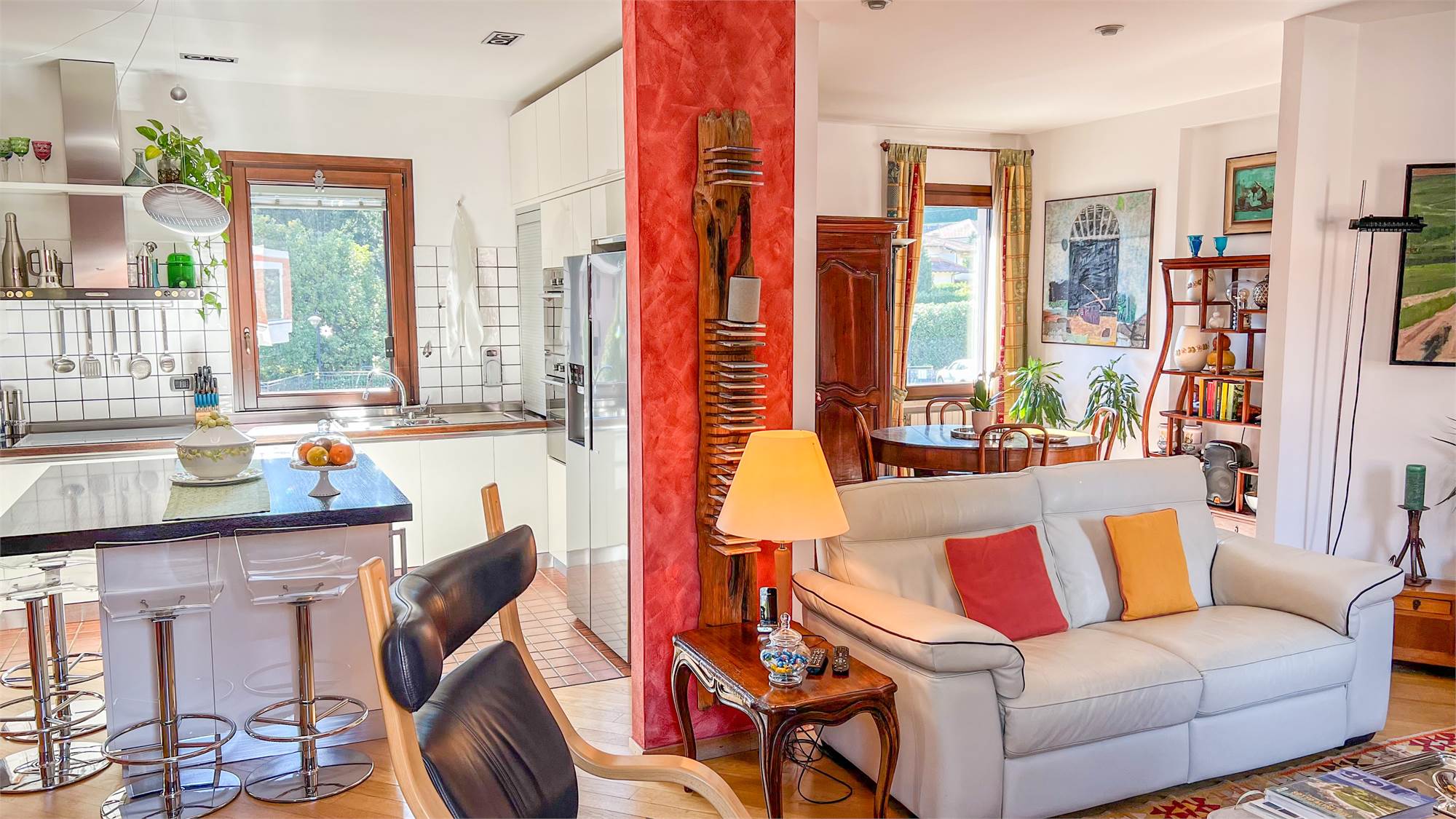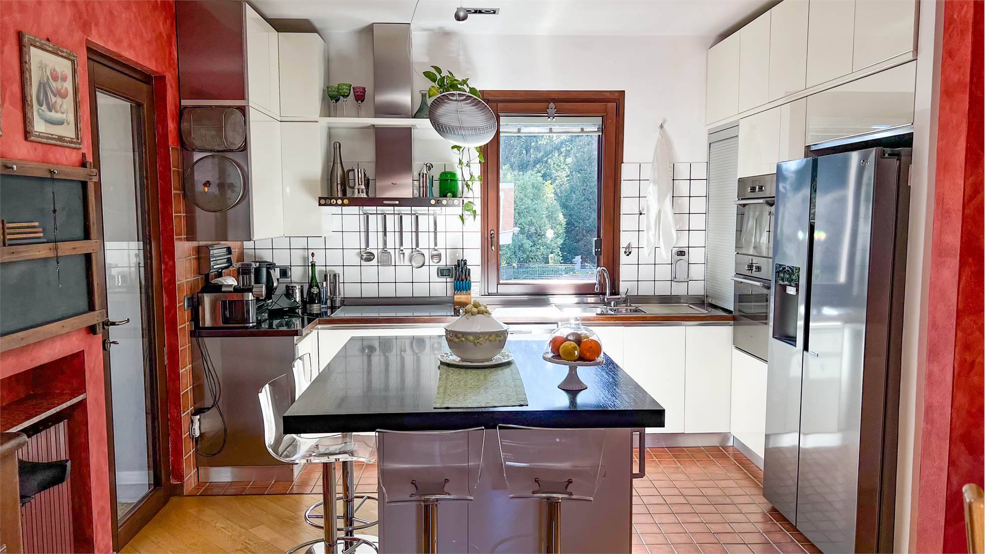 La cucina, a vista ma ben definita, è organizzata con isola centrale e si integra perfettamente nella zona living, mantenendo una propria identità funzionale.