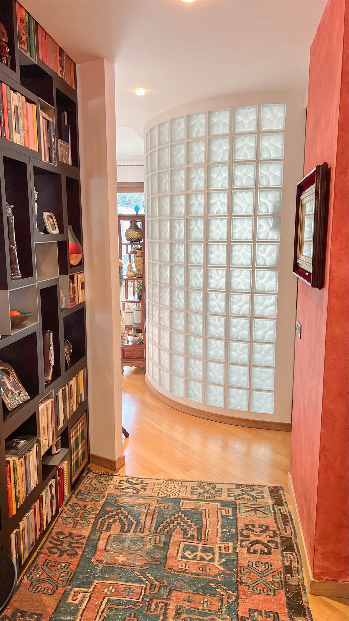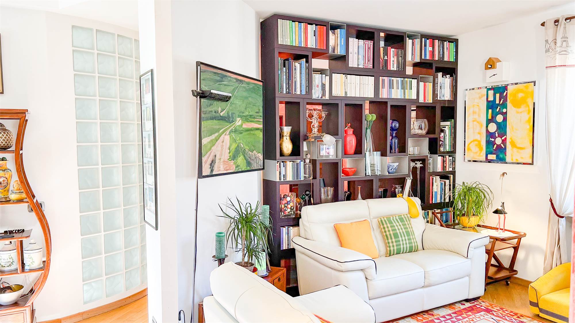 La zona giorno si apre su un ambiente articolato ma fluido, composto da area pranzo e soggiorno con camino, impreziosito da librerie e affacci luminosi. Gli spazi dialogano tra loro con naturale continuità, creando un ambiente conviviale ma al tempo stesso raccolto.