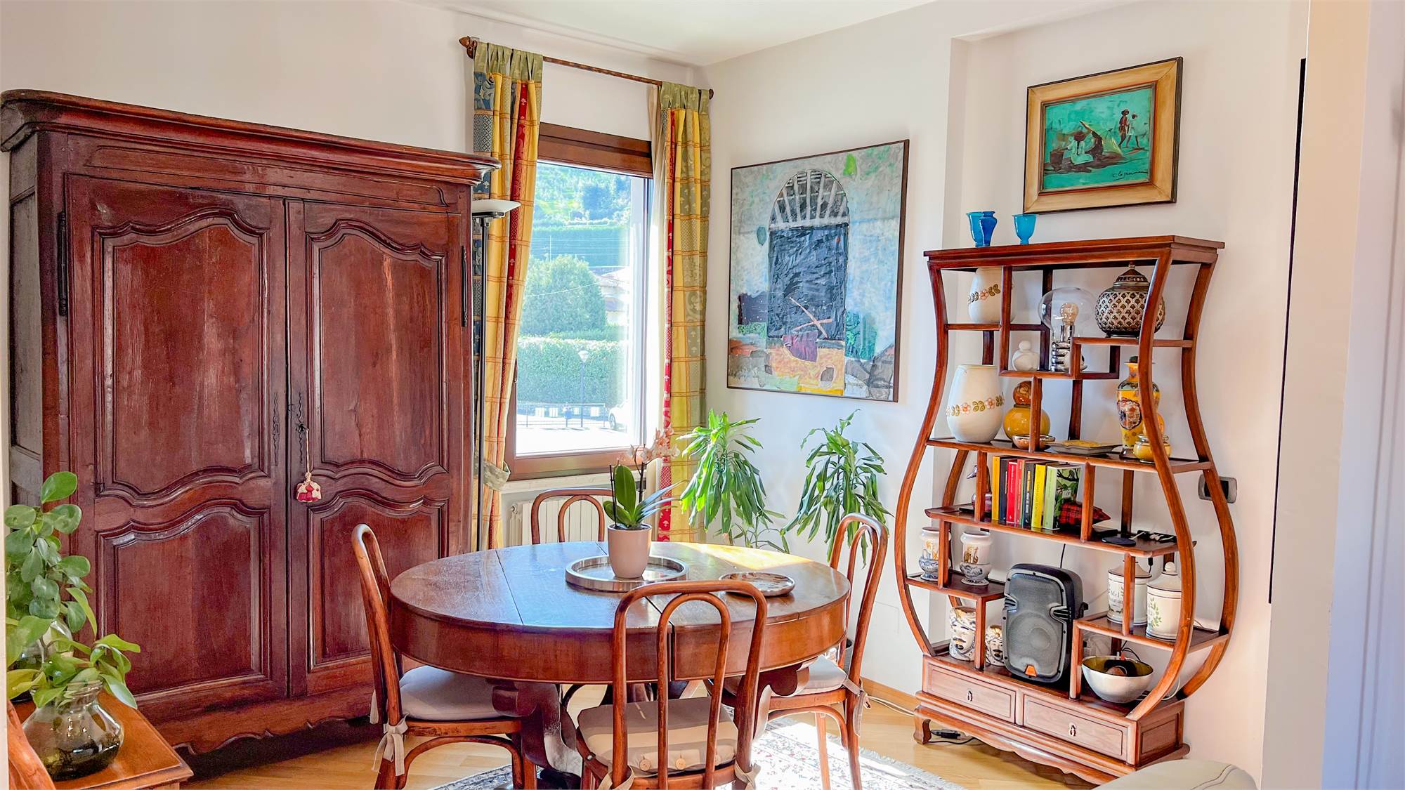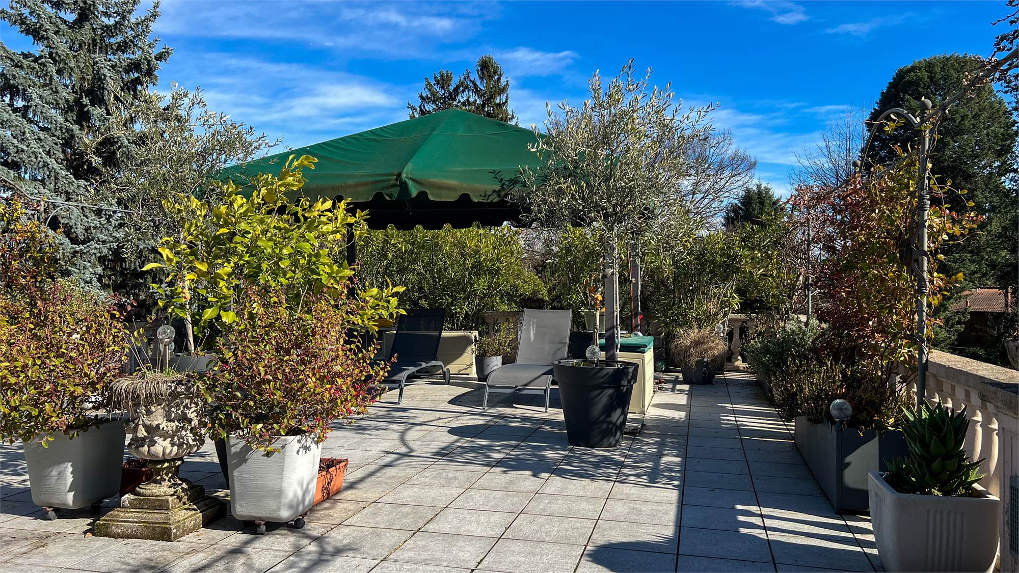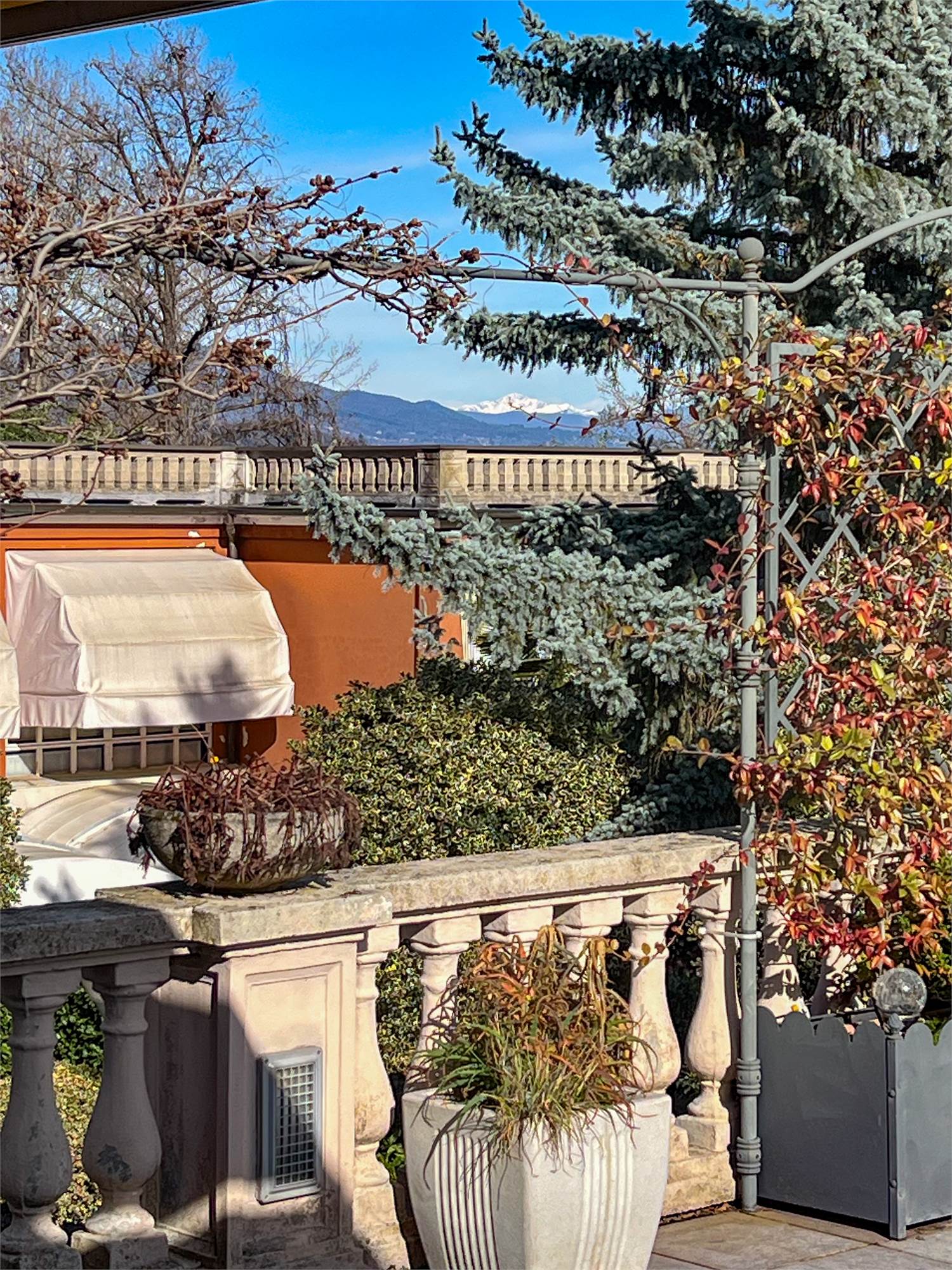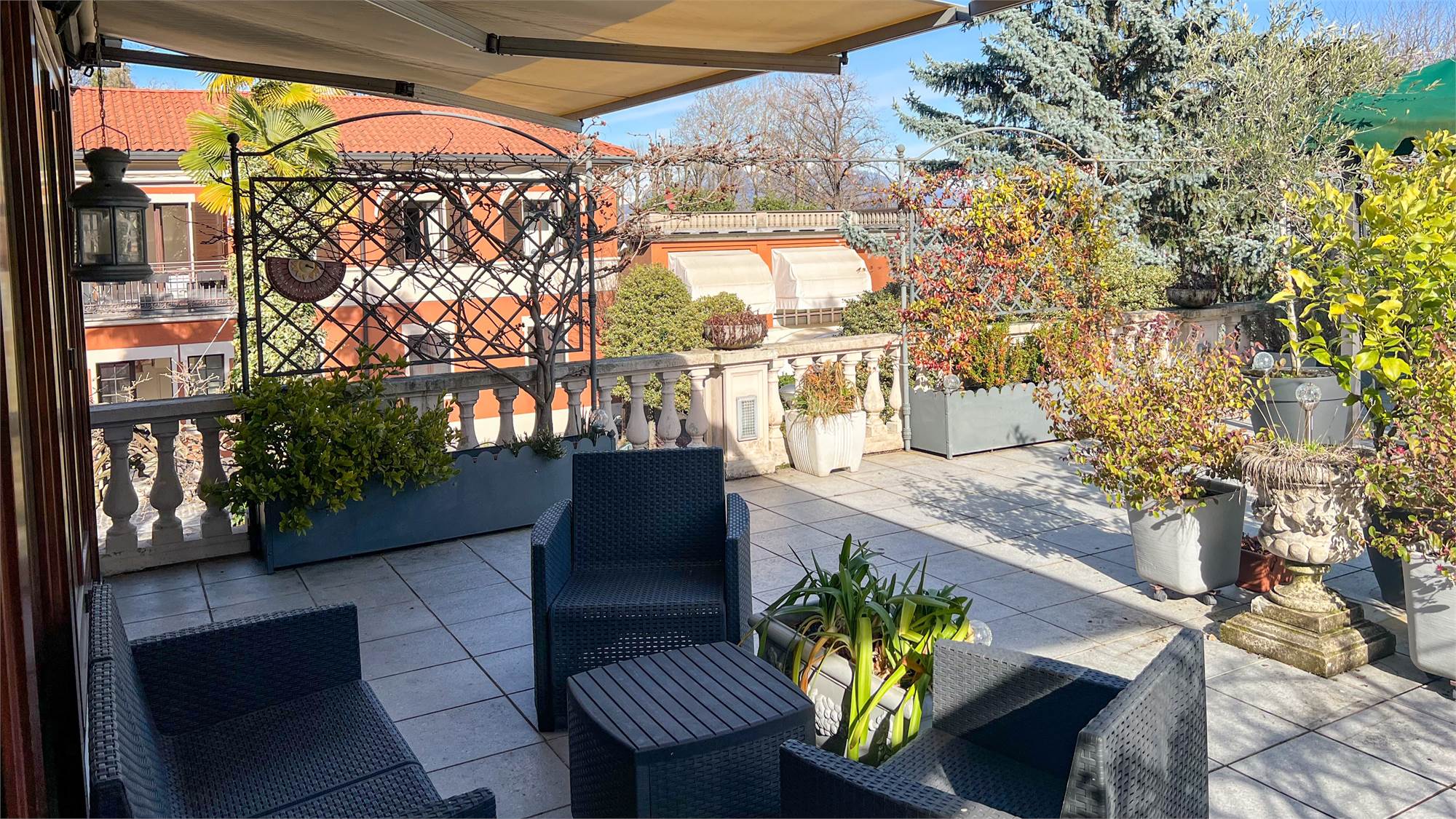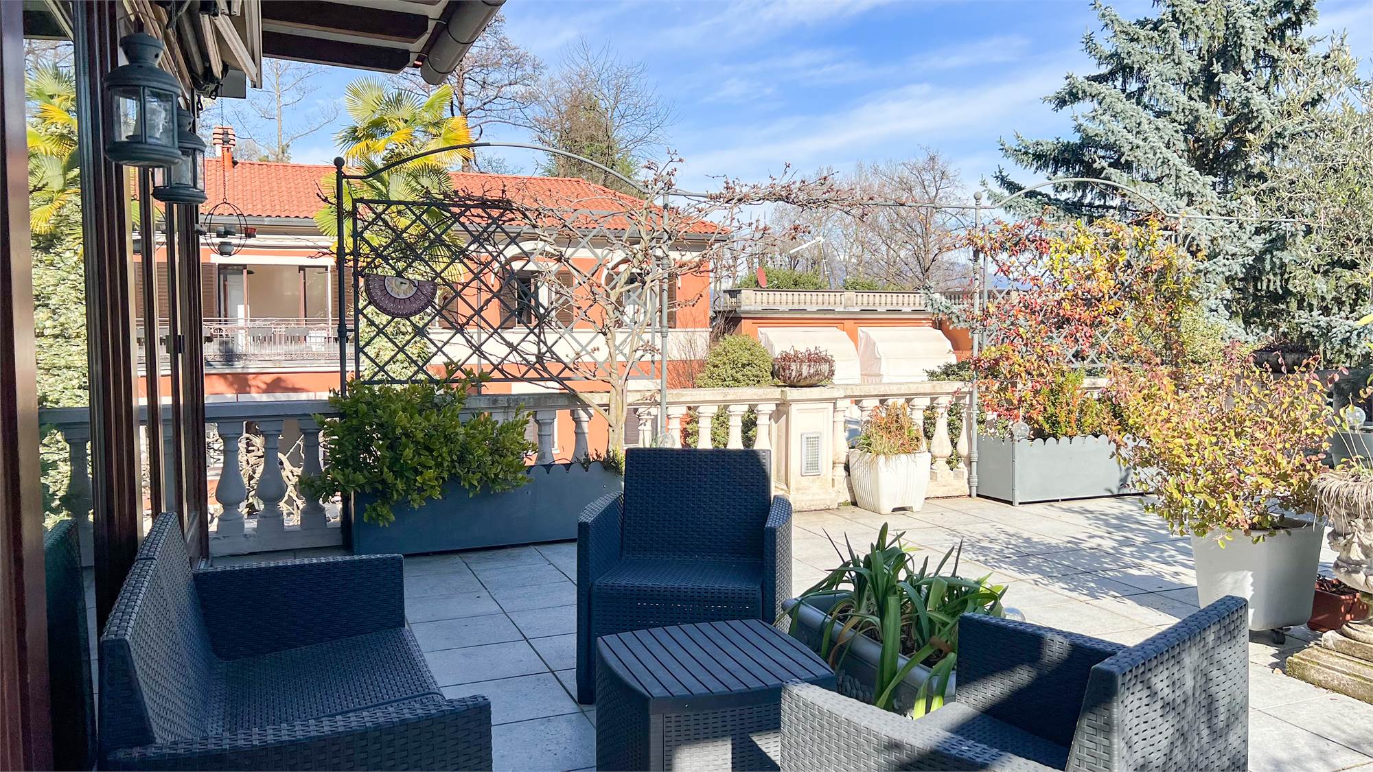 Da qui si accede al grande terrazzo, riservato e ben esposto, circondato dal verde e rifinito con dettagli classici. Uno spazio pensato per il relax e la convivialità, con affaccio sulla piscina condominiale e piacevoli scorci verso il lago.